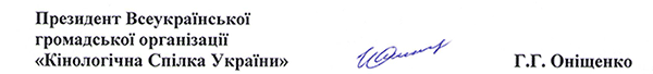 «Підписуючи цей документ я надаю згоду КСУ на обробку, зберігання та використання в базі даних КСУ, а також поширення в офіційних джерелах КСУ, виключно у зв’язку з кінологічною діяльністю КСУ, інформації про мене та моїх собак у тому обсязі, який я надав».