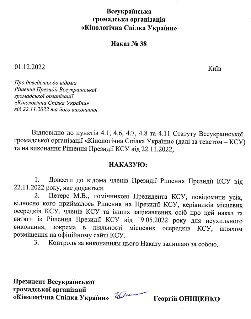 НАКАЗИ КІНОЛОГІЧНОЇ СПІЛКИ УКРАЇНИ
