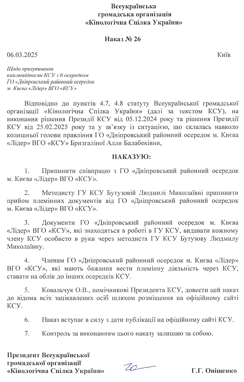 НАКАЗИ КІНОЛОГІЧНОЇ СПІЛКИ УКРАЇНИ