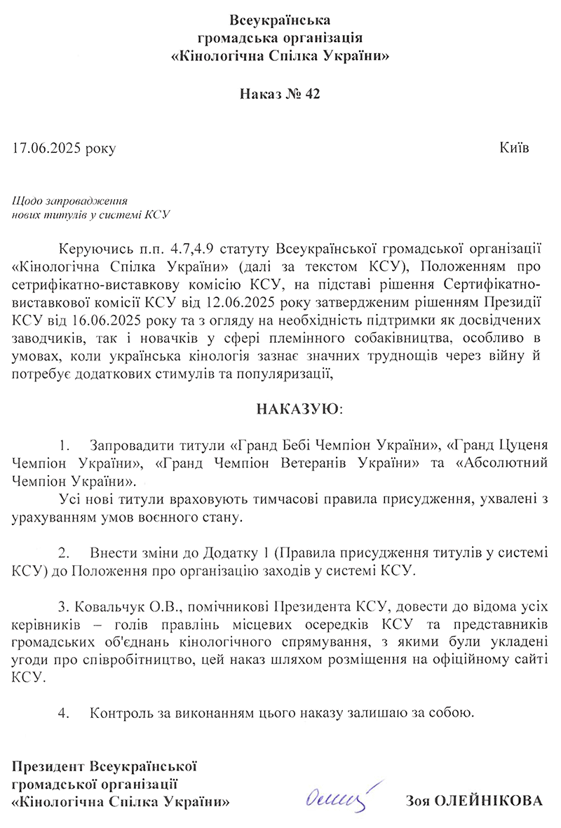 НАКАЗИ КІНОЛОГІЧНОЇ СПІЛКИ УКРАЇНИ