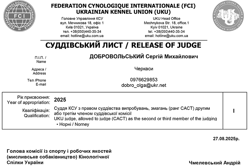 СУДДІ ЗА РОБОЧИМИ ЯКОСТЯМИ СОБАК МИСЛИВСЬКИХ ПОРІД * ДОБРОВОЛЬСЬКИЙ Сергій Михайлович