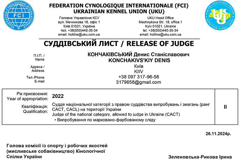 СУДДІ ЗА РОБОЧИМИ ЯКОСТЯМИ СОБАК МИСЛИВСЬКИХ ПОРІД * KONCHAKIVS'KIY DENIS / КОНЧАКІВСЬКИЙ Денис Станіславович