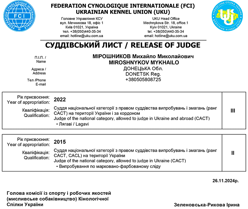 СУДДІ ЗА РОБОЧИМИ ЯКОСТЯМИ СОБАК МИСЛИВСЬКИХ ПОРІД * MIROSHNYKOV MYKHAILO / МІРОШНИКОВ Михайло Миколайович