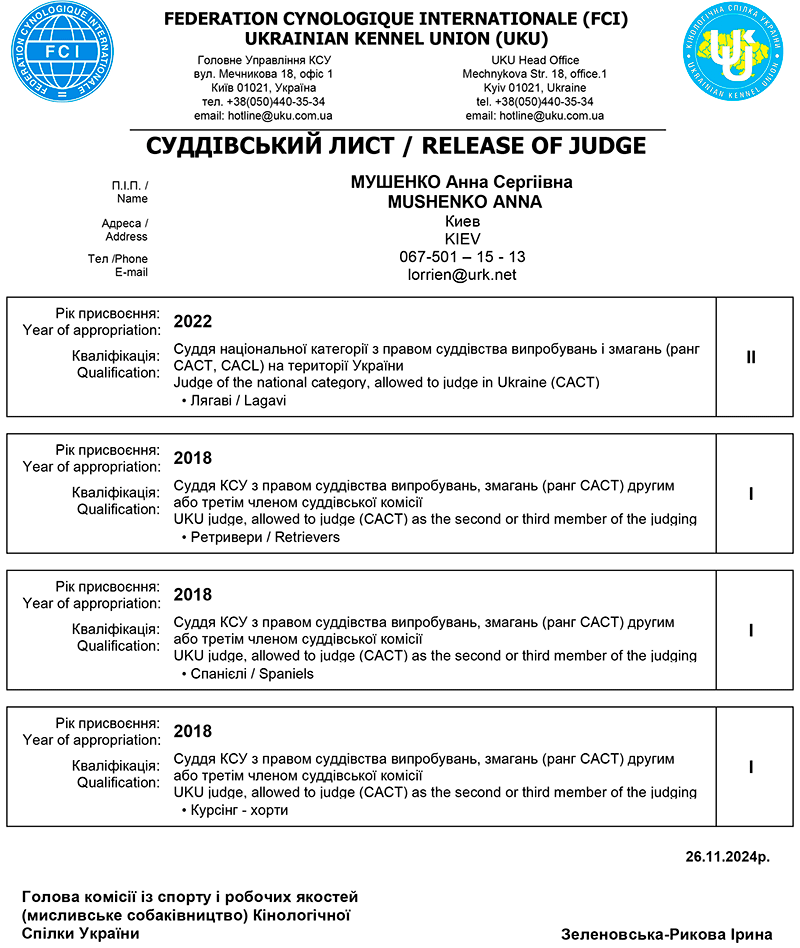 СУДДІ ЗА РОБОЧИМИ ЯКОСТЯМИ СОБАК МИСЛИВСЬКИХ ПОРІД * MUSHENKO ANNA / МУШЕНКО Анна Сергіівна