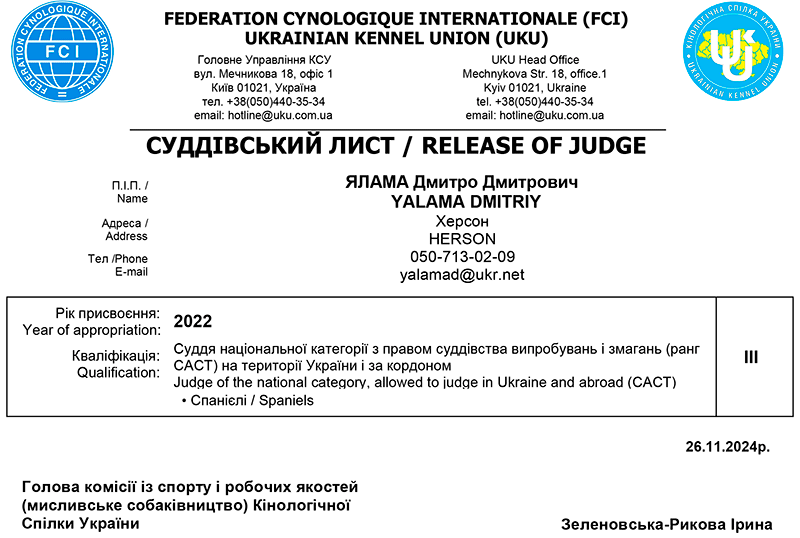 СУДДІ ЗА РОБОЧИМИ ЯКОСТЯМИ СОБАК МИСЛИВСЬКИХ ПОРІД * YALAMA DMITRIY / ЯЛАМА Дмитро Дмитрович