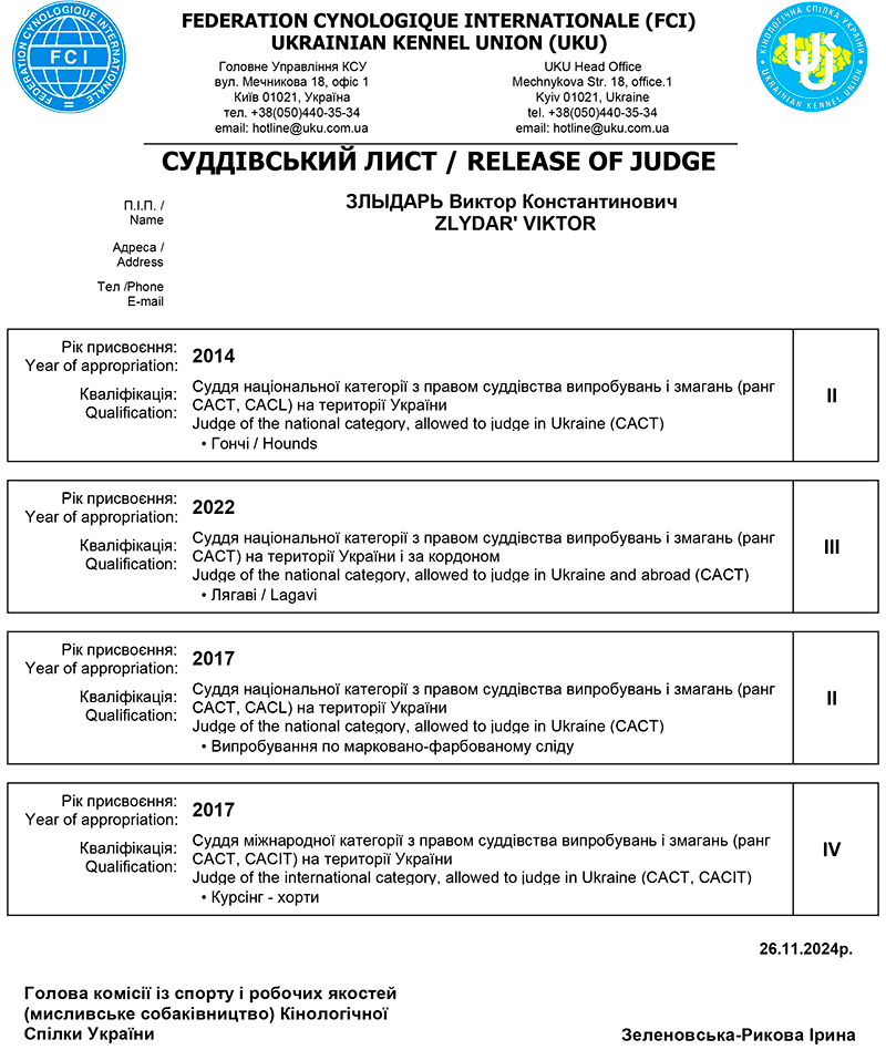 СУДДІ ЗА РОБОЧИМИ ЯКОСТЯМИ СОБАК МИСЛИВСЬКИХ ПОРІД * ZLYDAR' VIKTOR / ЗЛЫДАРЬ Виктор Константинович