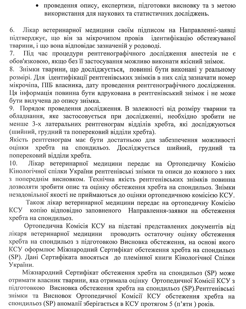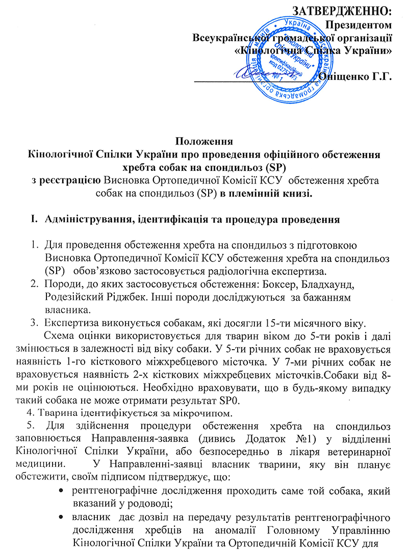 ПОЛОЖЕННЯ КСУ про проведення офіційного обстеження хребта собак на спондильоз (SP)